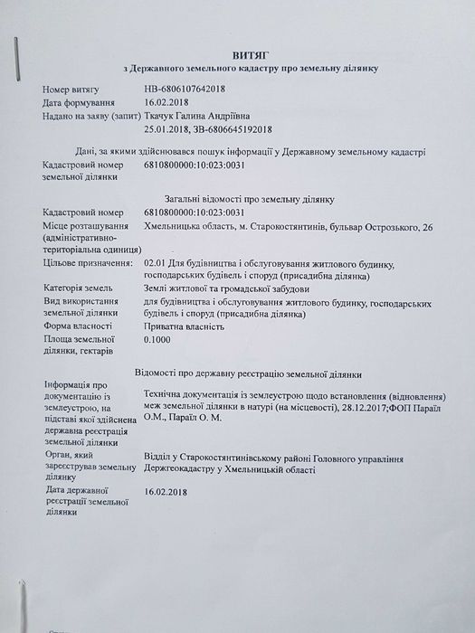 м. Старокостянтинів, бульвар Острозького, 26 (р-н. Бойні). Район активно розвивається. Поруч дорога та житлові будинки. Неподалік величезний ліс та ставок. Ділянка рівна, приватизована, кадастровий номер 68*****000:10:023:0031. Поряд газ, світло, вода.