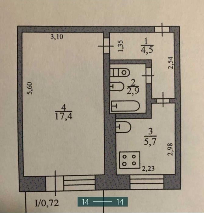 Загальна площа – 31,4 кв.м., житлова – 17,4 кв.м.