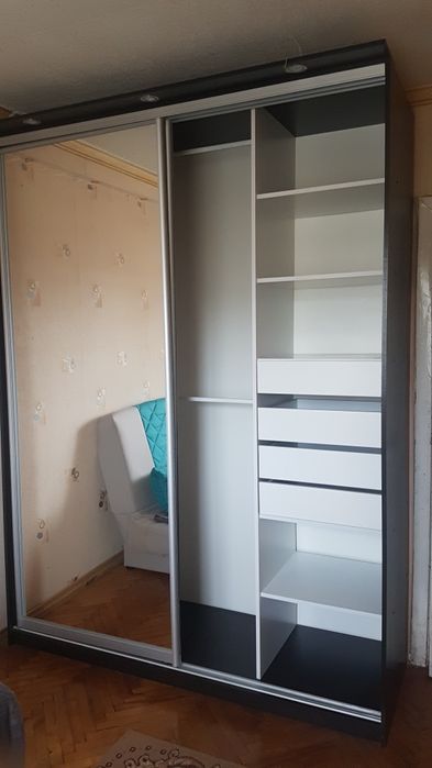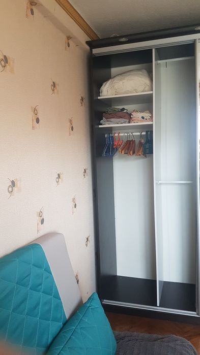 Перша кімната обладнана диваном і шафою купе.