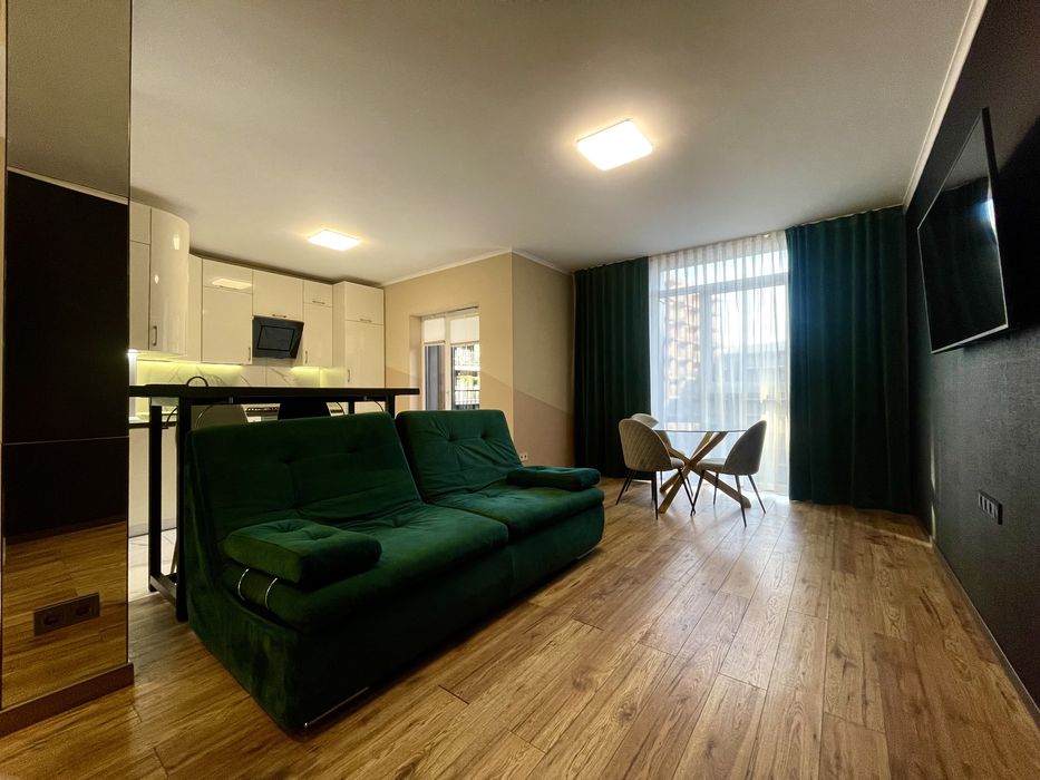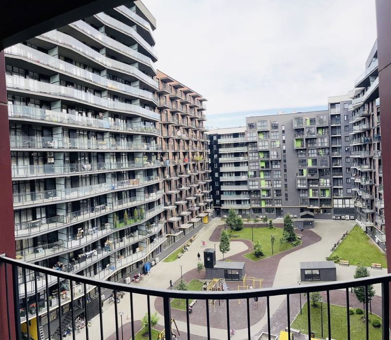 Кухня-студія, ізольована спальня, гардеробна зона, кладова-пральня, балкон