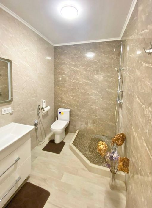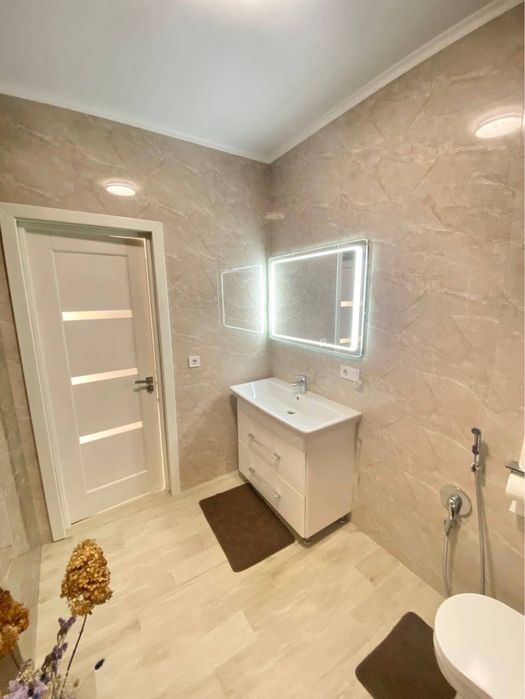 Сантехніка нова. Є балкон не засклений. В квартирі є Телевізор, Шафа, Холодильник, Ліжко, Диван, Пральна машина з сушкою, Мікрохвильовка, Кондиціонер, Лічильники, Посудомийна машина.
