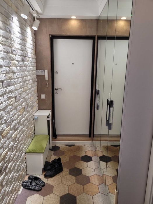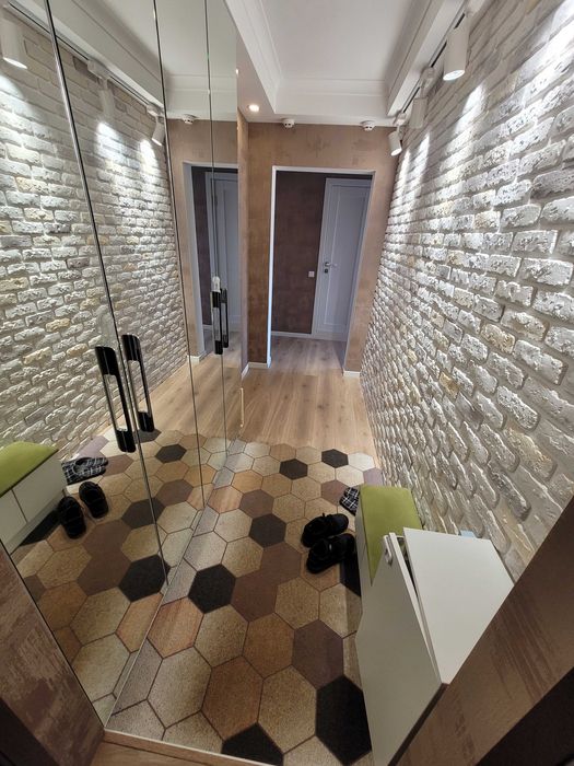 Прихожа має тумбочки та дзеркальні вбудовані шафи, стіна з декоративною цеглою зі спотовою пісвіткою.