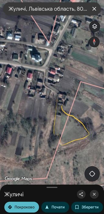 Будинок з землею в селі Жуличі, Золочівського району, Львівської обл.; Продаються дві ділянки з будинком (в аварійному стані) (одна 0,4 га - земля с/г призначення, друга 0,1027 га під забудову). Ділянки приватизовані.