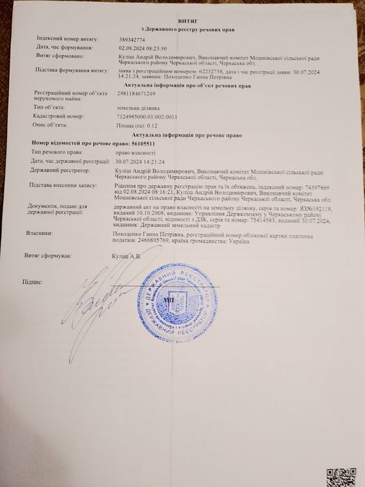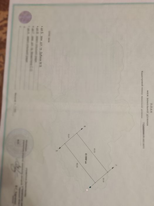 Площа:0,12га (370$ за 1 соту); кадастровий номер: 7124985000