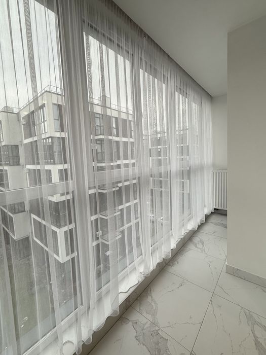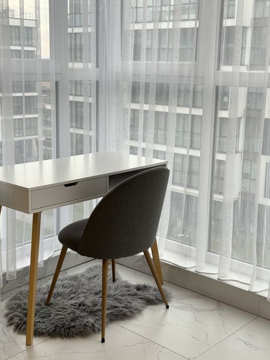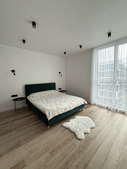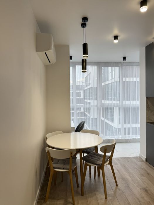 - Освітлення та простір: Великі панорамні вікна наповнюють квартиру природним світлом та створюють відчуття простору.