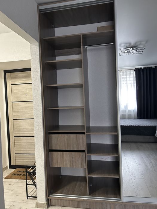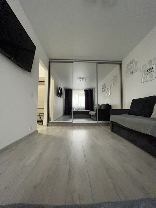 Окрема спальня з двоспальним ліжком, диван розкладний, телевізор, вбудована шафа-купе.