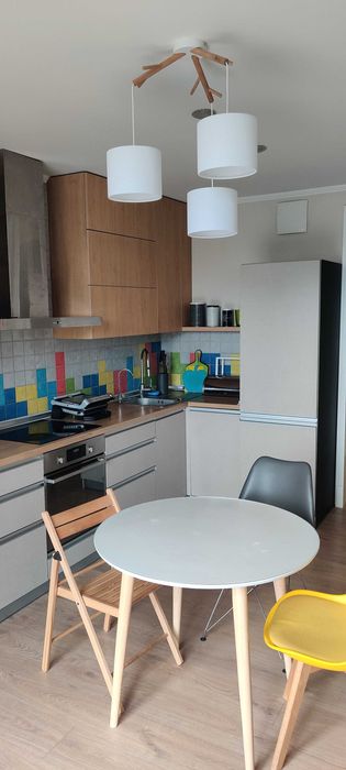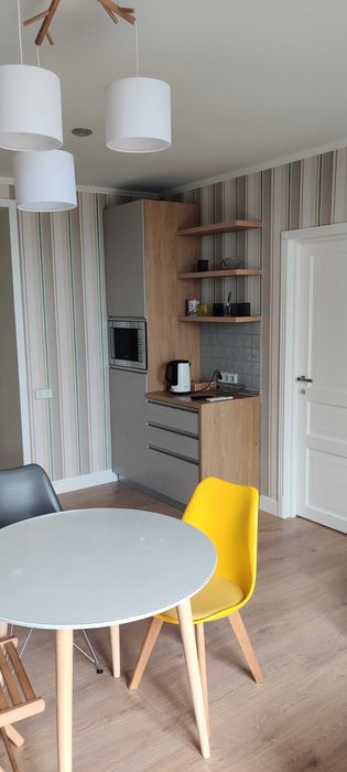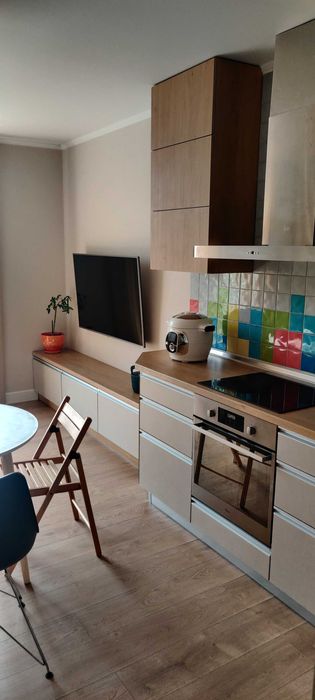 Кухня/вітальня (кухня-студія) – 23 м2, мікрохвильовка, електрочайник, індукційна електроплита, духовка, витяжка, холодильник, посудомийна машина, мультиварка, все необхідне для приготування і споживання їжі (каструлі, сковорідки, тарілки, прибори і тд), гриль, стіл, 3 стільці, телевізор, диван, стіл-трансформер, кондиціонер, праска, блендер.