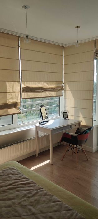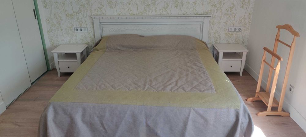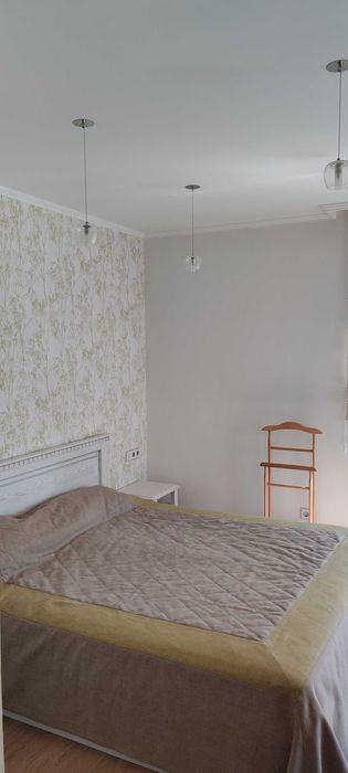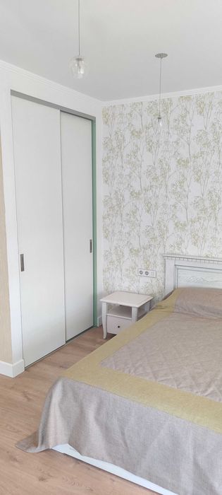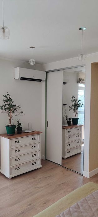 Кімната 1 (спальня) – 17.5 м2, ліжко з підйомним механізмом (місце для зберігання), ортопедичний матрац (спальне місце 180х200см), дві приліжкові тумби, дві шафи купе, комод, стіл зі стільцем, кондиціонер, вихід на засклений балкон (7 м2).