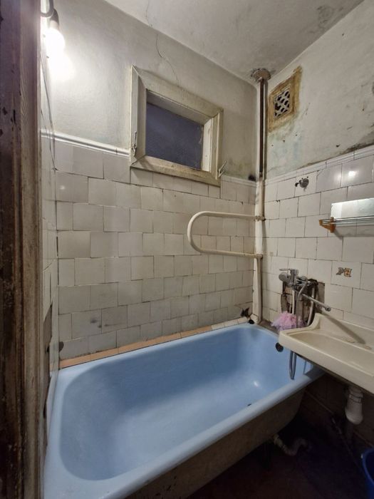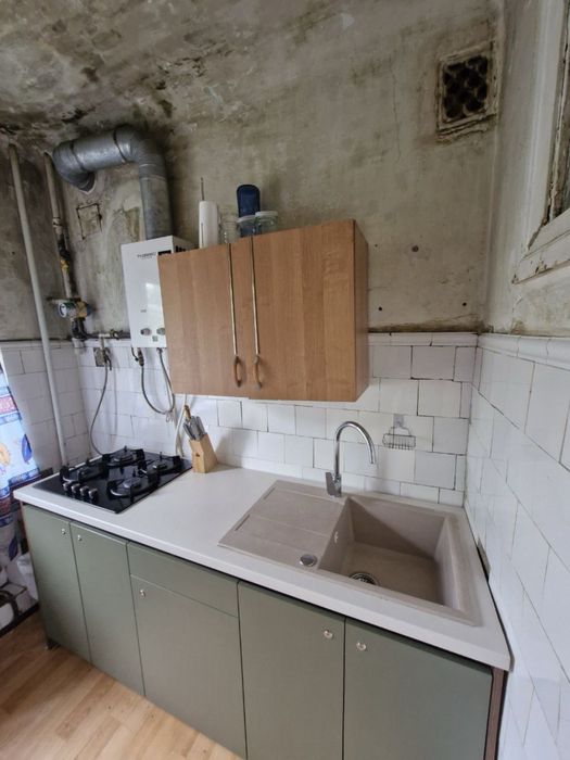 На кухні встановлена нова робоча зона. Сумісний санвузол з реставрованою ванною та пральною машиною.