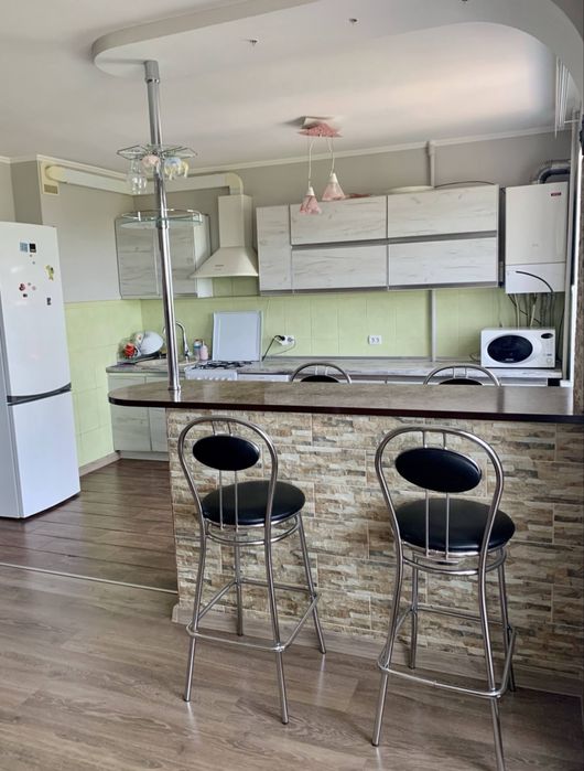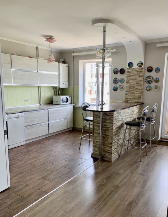 Трикімнатна квартира, але одна з кімнат зʼєднана з кухнею ( кухня-студія), а також дві спальні.