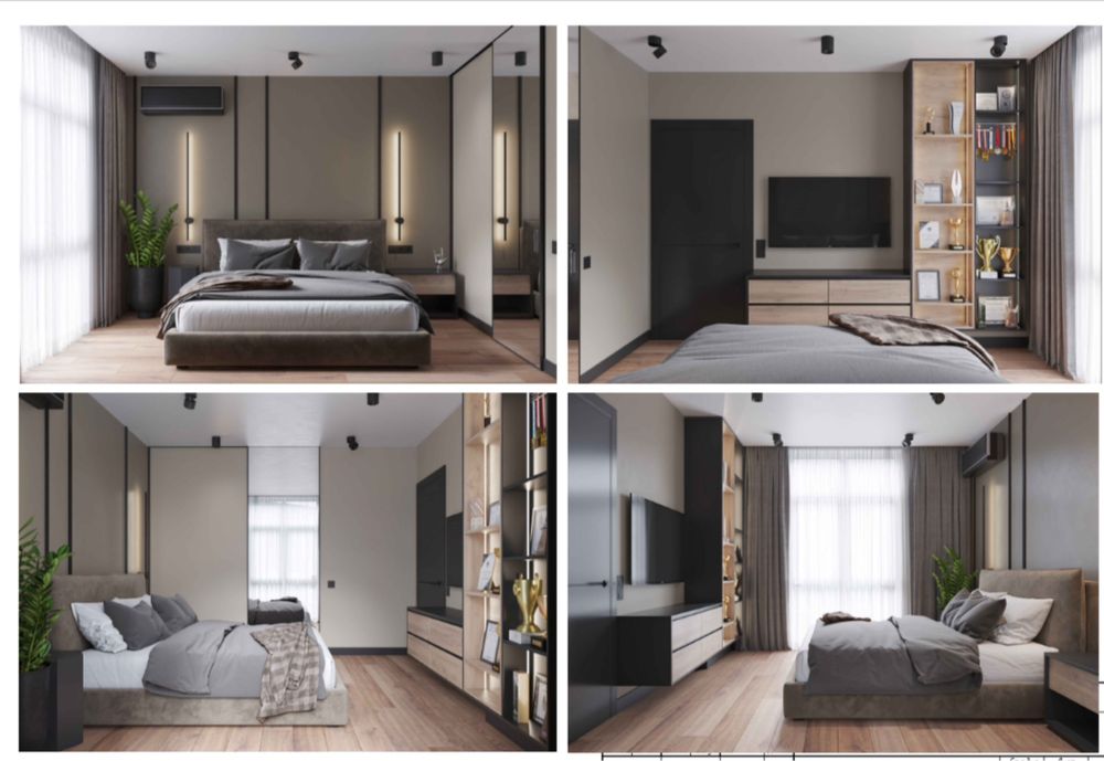Планувалось створення органомічного простору з двома гардеробними, спальнею, кухнею-вітальною, коридором та ванною кімнатою де палітра — витримана, відтінки бежу, графіт, теплий горіх, світлий бетон, спокій та стиль в дизайні.