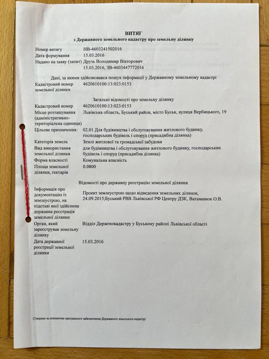 Земельна ділянка для будівництва у м. Буськ; Земельна ділянка на вʼїзді в місто Буськ, вул. Вербицького, 19. Площа 8 соток, цільове призначення під будівництво житла. Комунікації поблизу, район малоповерхової забудови, за кілька сот метрів річка Західний Буг. Прошу писати на телеграм на вказаний номер.