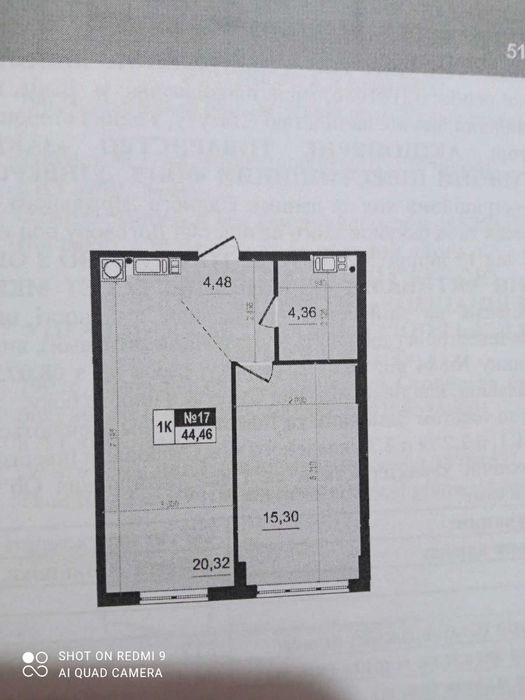 Квартира знаходиться на третьому поверсі, площа - 44,46 м.кв. житлова площа - 15,3 м.кв. кухня - студія - 20,32 м.кв. Індивідуальне газове опалення - двох контурний газовий котел. Лічильники - газу, води, та світла.