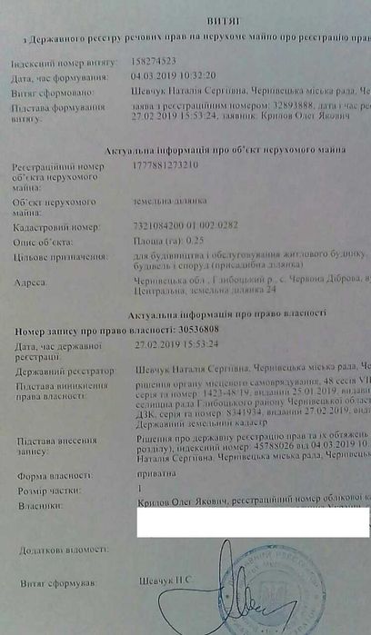 Продам земельну дiлянку, с. Червона Дiброва; Продається земельна дiлянка за адресою: Чернiвецька обл., Глибоцткий р., с. Червона Дiброва, вул. Центральна, земельна дiлянка 24. 20км вiд центра Чернiвцiв.