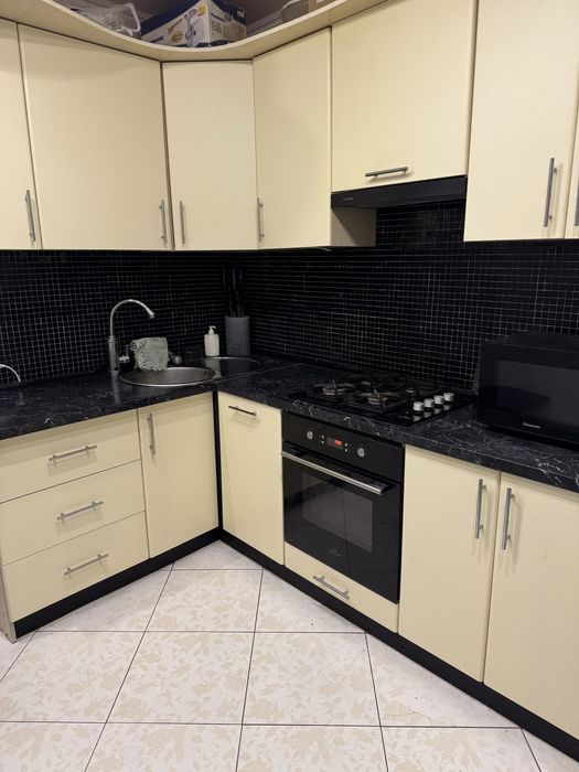 На кухні залишаються вбудовані меблі, духовий шкаф, варочна поверхня,витяжка, холодильник, кран з режимом нагріву води та посудомийна машина