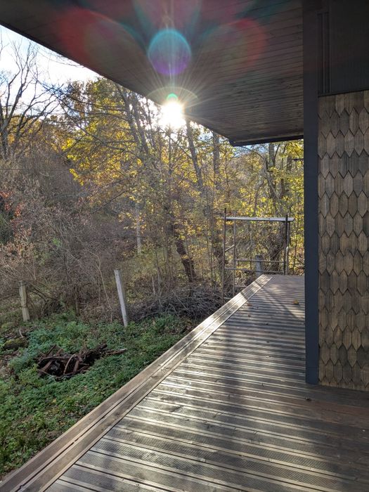 Каркасний будинок з терасою; Екологічний та сучасний каркасний будинок площею 33 м² з просторою терасою 32 м² – ідеальне рішення для комфортного відпочинку на природі, дачі чи навіть постійного проживання. Побудований за скандинавською технологією з використанням якісних матеріалів: каркас з сухої струганой деревини, утеплення мінеральною ватою.