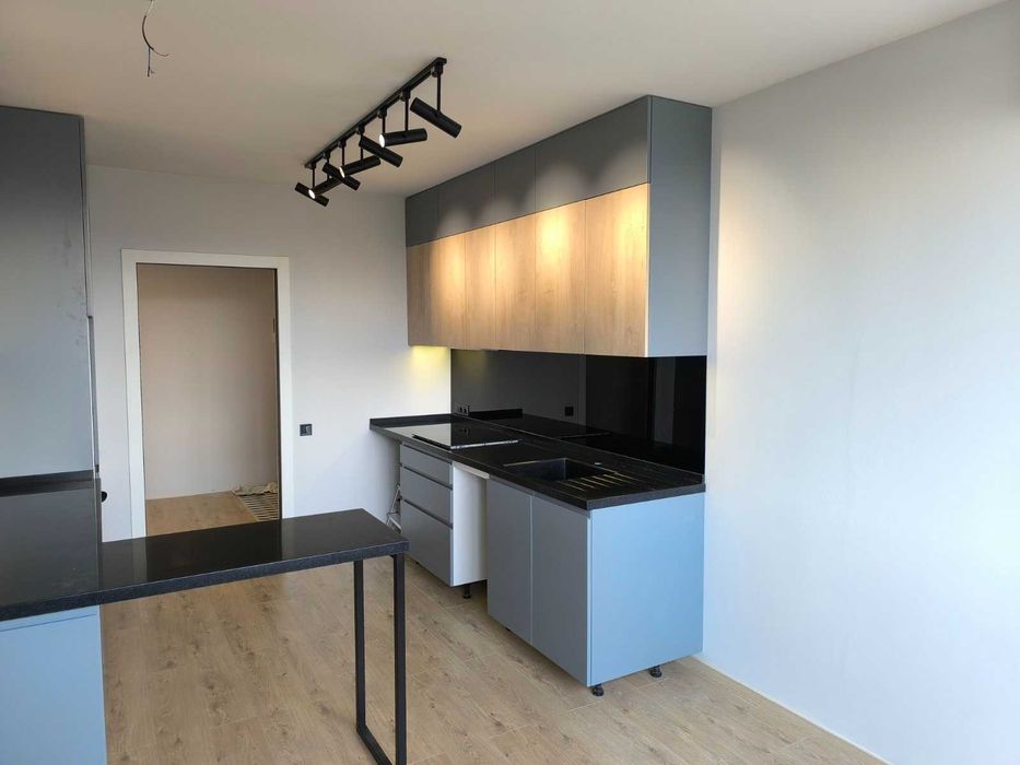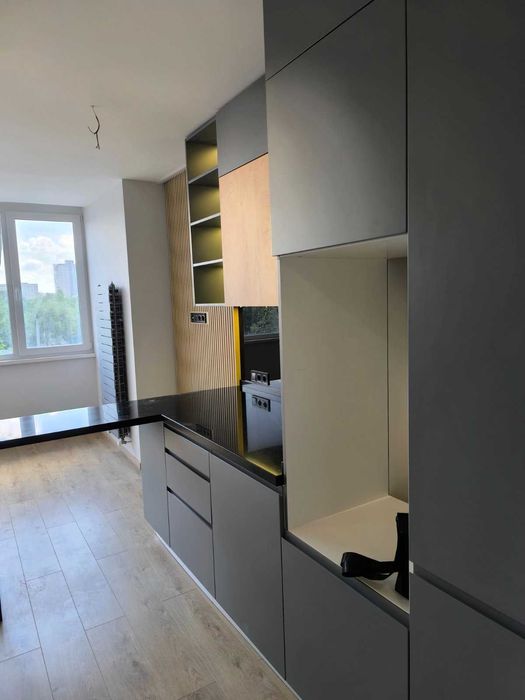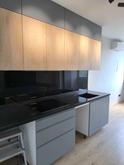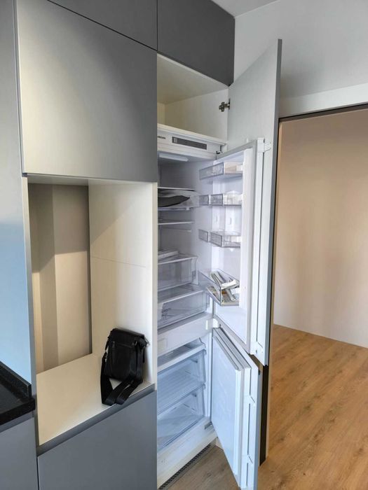 в кухне стоит корпусная мебель, со встроенным холодильником и варочной поверхностью, мягкой мебели нет