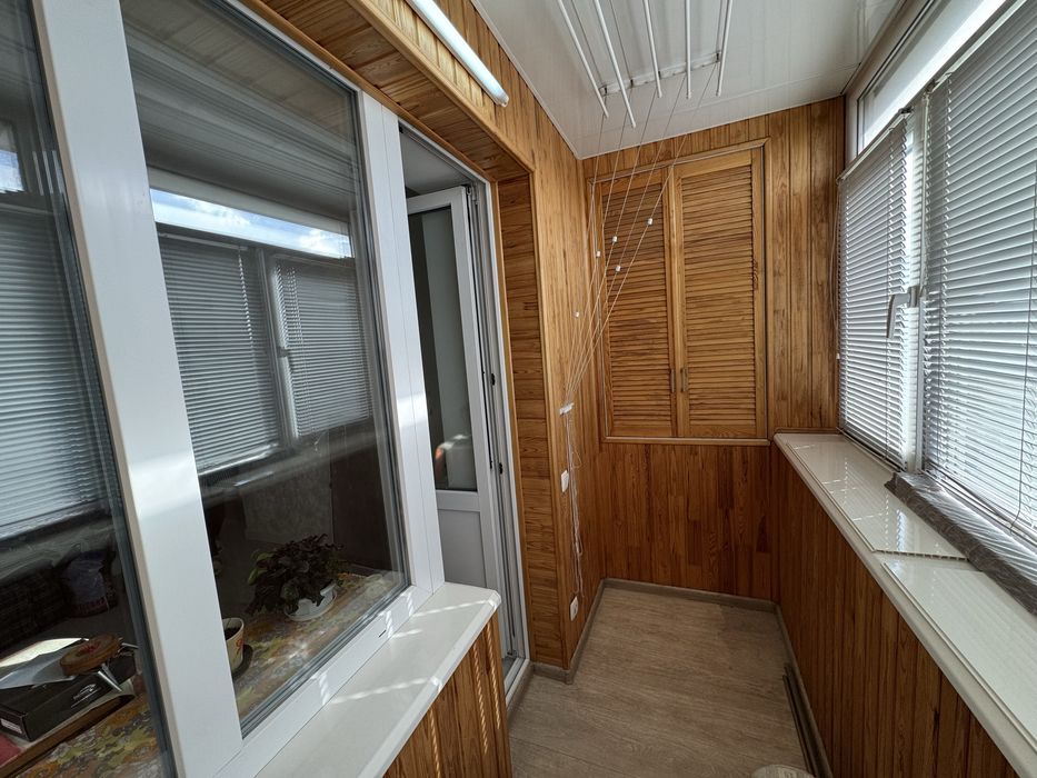 Балкон утеплений та розширений, є освітлення, встановлені внутрішні полички з обох боків.