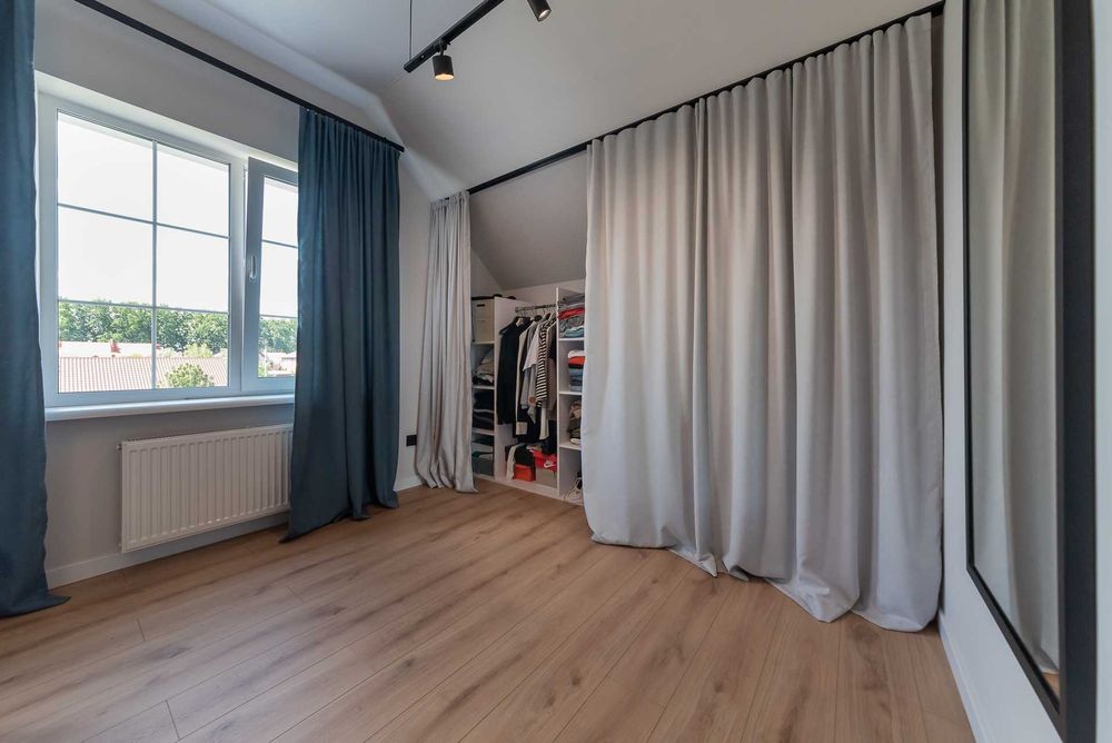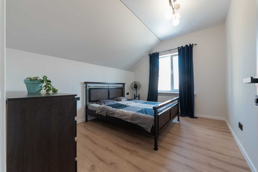 Функціональний будинок площею 134 м², висота стелі 3 метри, має два поверхи та облаштоване горище