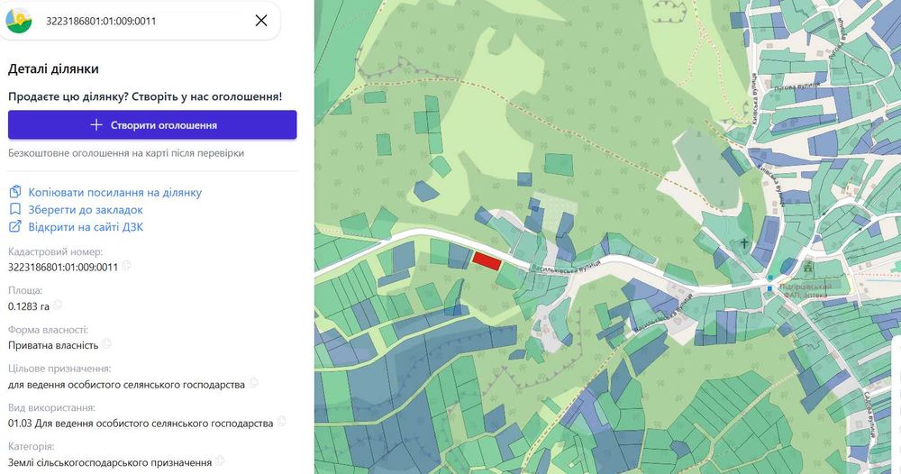 Поруч ділянки з призначенням "під будівництво будинку", позначені зеленим кольором на карті та "сільськогосподарського призначення" - синім.