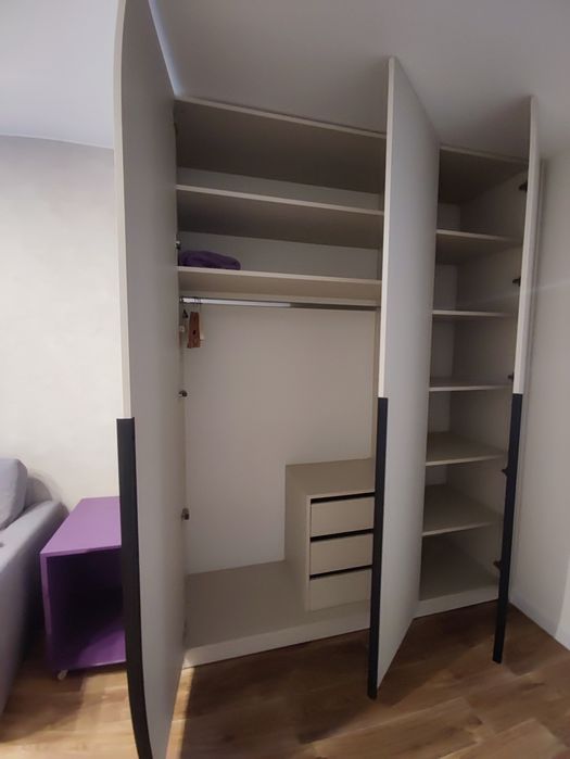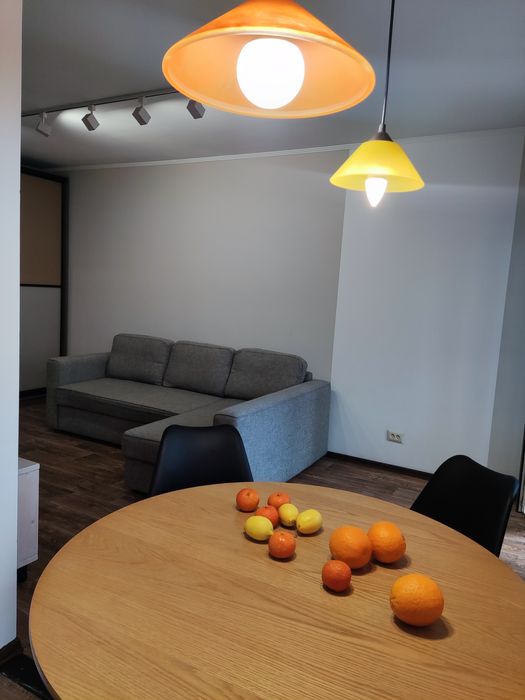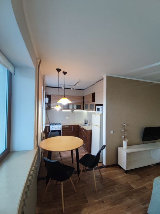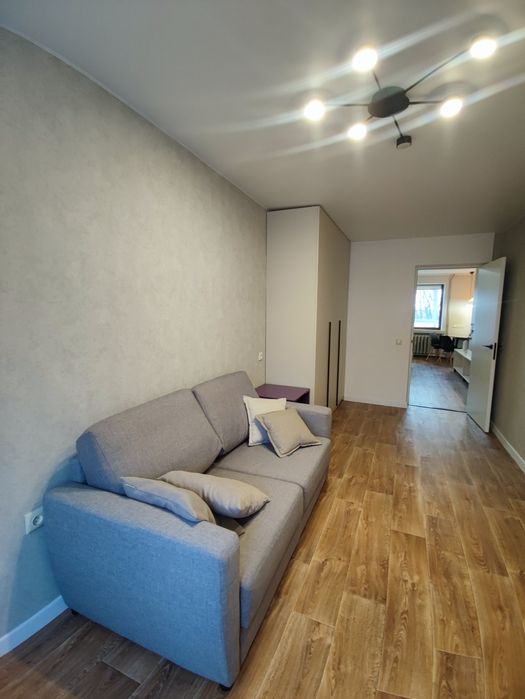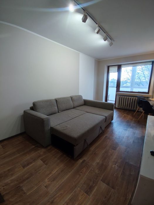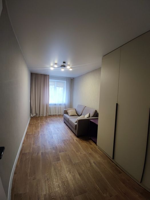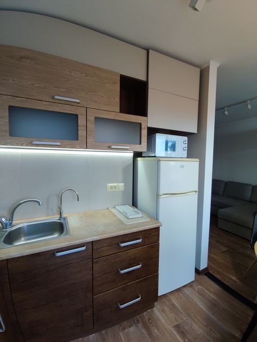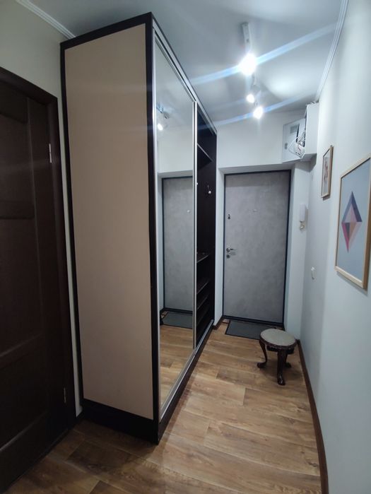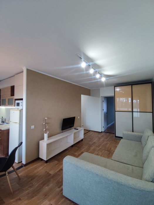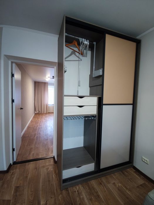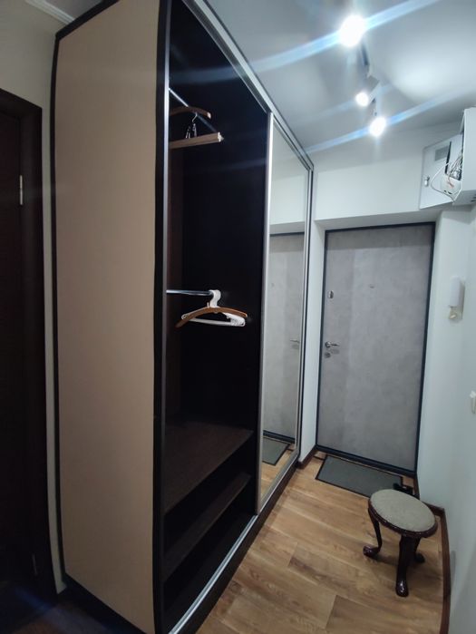 Кухня-студія і окрема спальня, в обох кімнатах розкладні дивани, місткі та продумані шафи.
