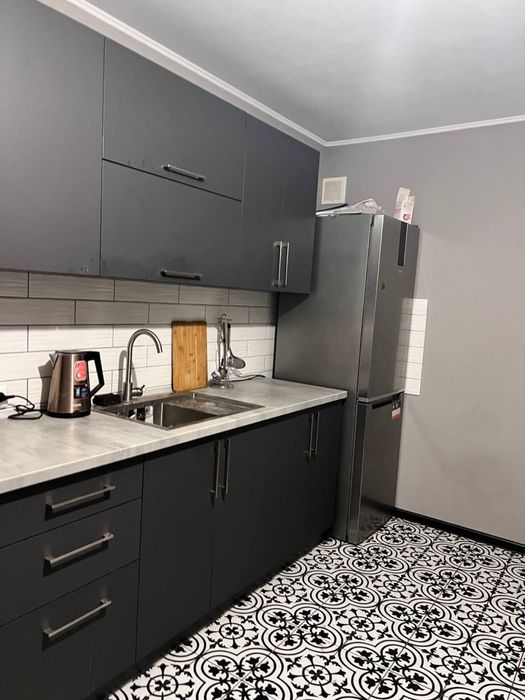 досить простора квартира, в кухні досить багато місця і багато шафок, є деякий посуд, є телевізор