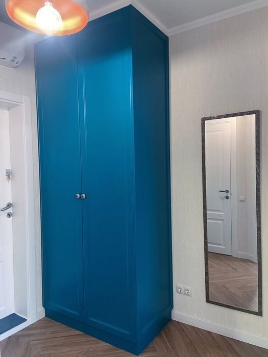 • Багато місць для зберігання: усі шафи та кухня вбудовані під стелю — у спальні, коридорі, ванній та кухонній зоні.