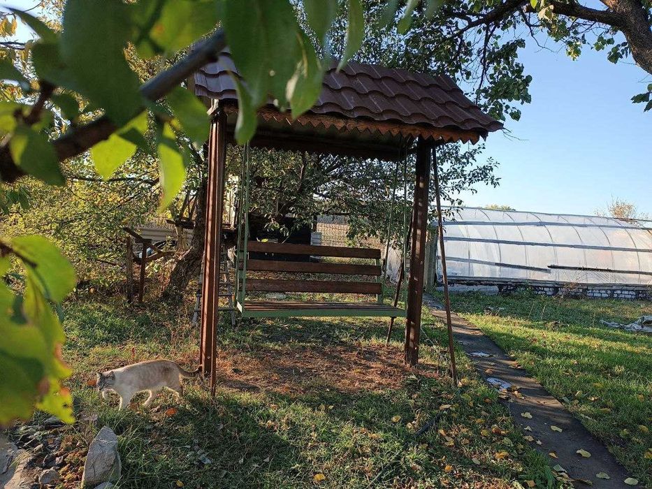 Мангал із бесідкою, гойдалка, маленький декоративний пруд, каркас для теплиці, курник.