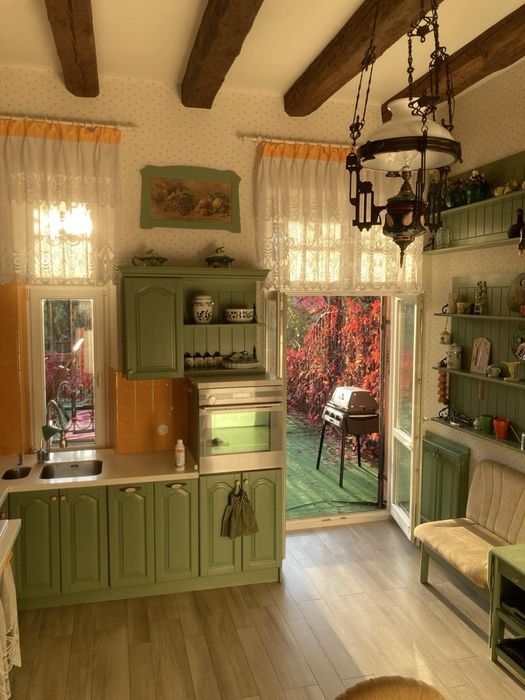 Велика кухня з дровяним каміном і виходом на терасу.