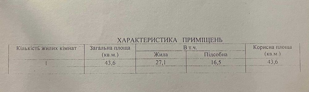 Площа квартири – 43.6 м², жила площа - 27.1 м². Квартира укомплектована тим що зображено на фото.