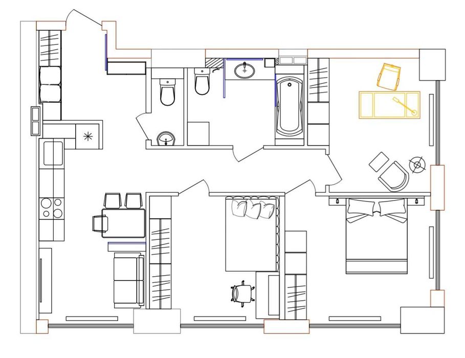 Пропонується квартира з вільним плануванням, яку легко адаптувати під ваш дизайн-проєкт. Можливе планування: три спальні + кухня-студія або дві спальні + гардеробна + велика кухня-студія.