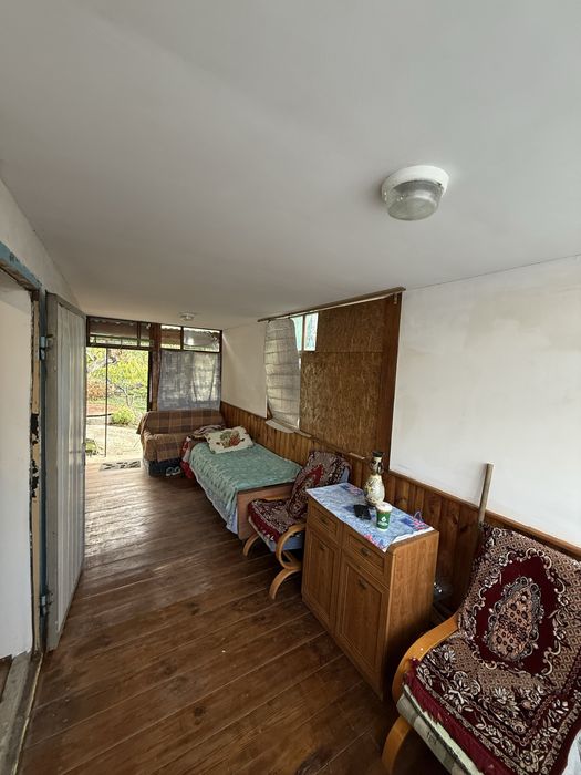 Диван раскладной, кровать, стол раскладной, ковры, садовый инвентарь, посуда, газовый таганок с балоном, Шкаф для белья.