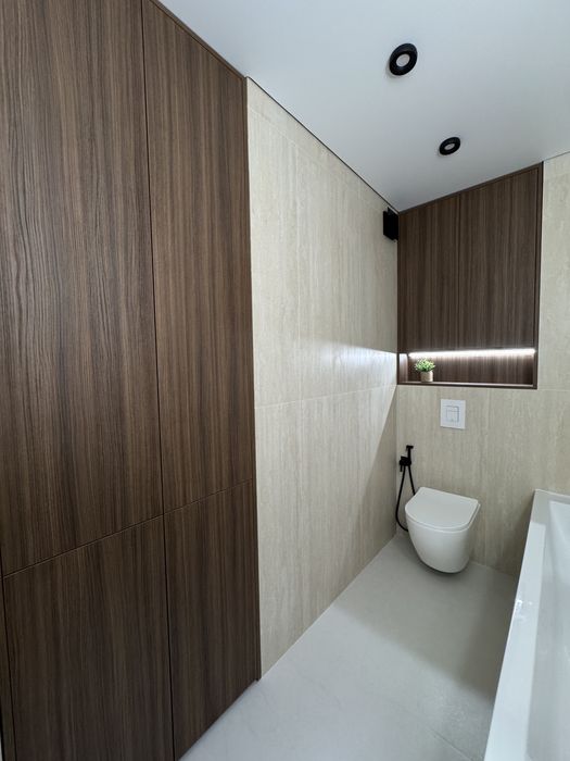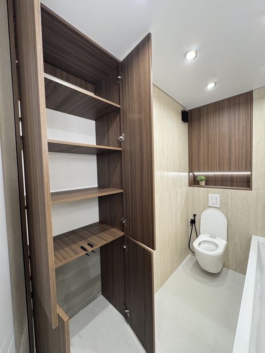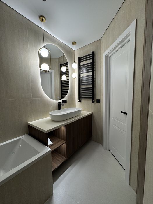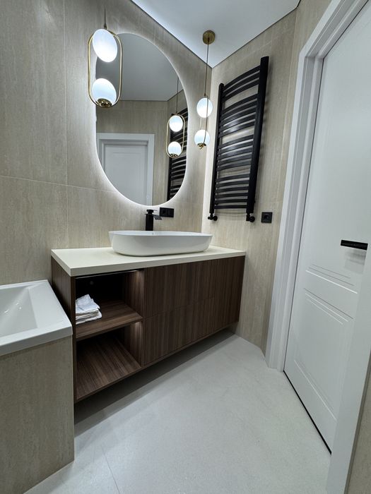 • Повноцінна ванна кімната з преміальною плиткою, меблями під темний горіх та багатьма прихованими поличками для зберігання.