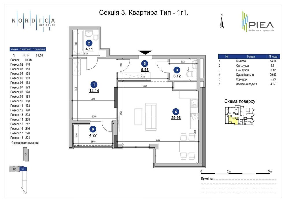 61,5 м², Євро-2, одне з найвдаліших планувань у Nordica Residence.