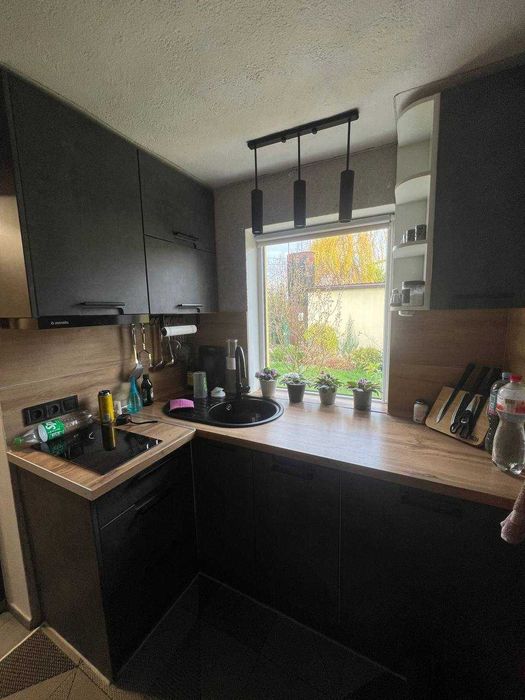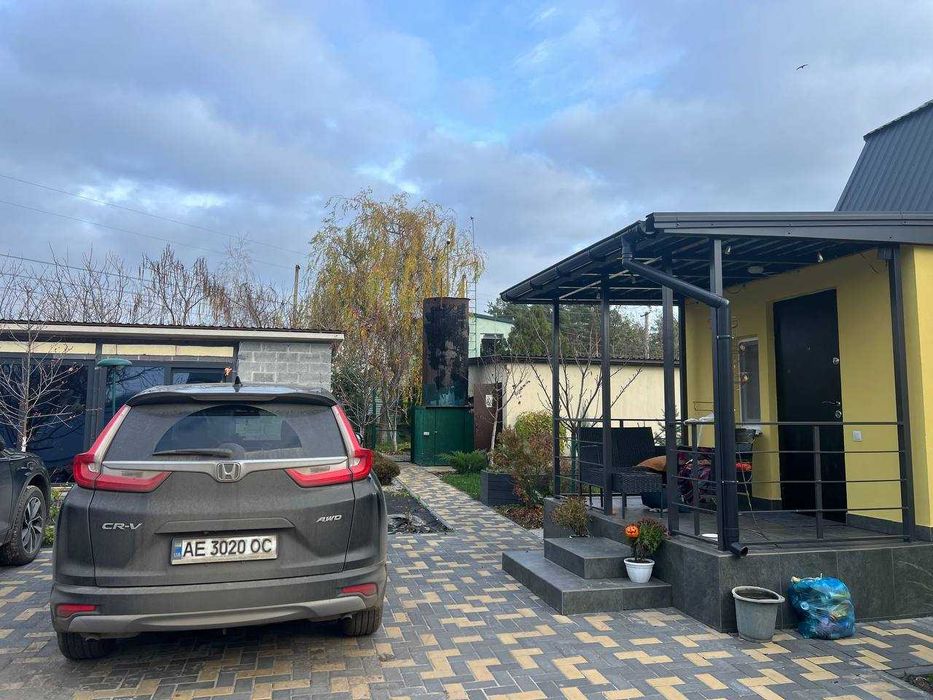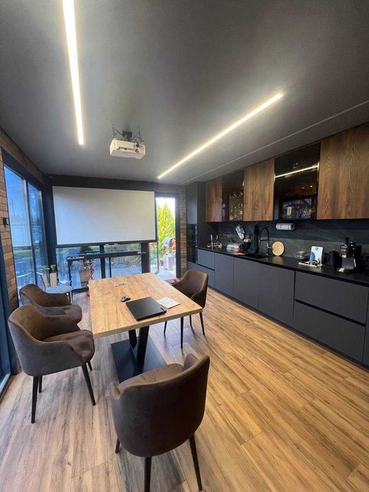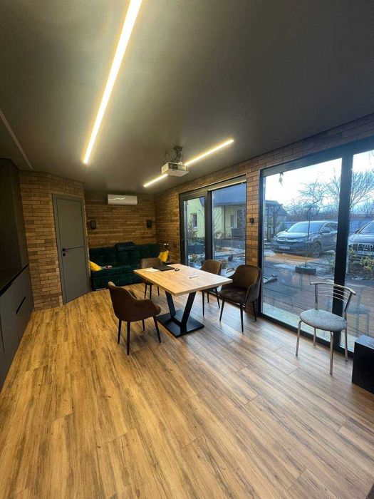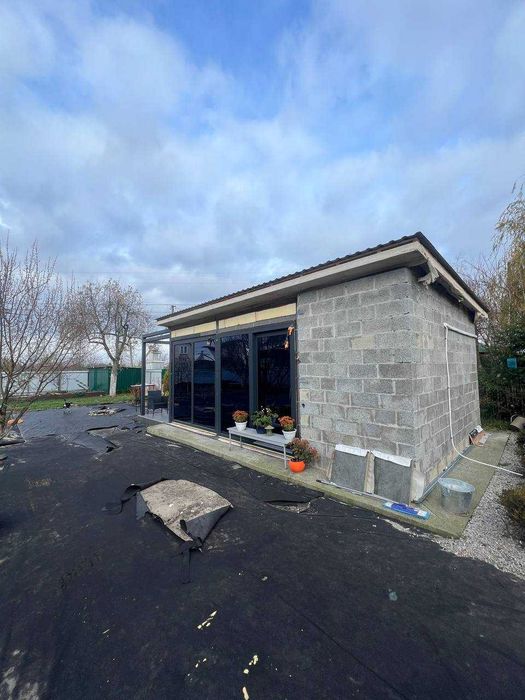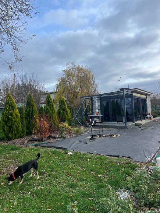 Окремо від будинка побудована кухня 25 м2 з французькими вікнами WDS70, водним опаленням, вбудованою кухнею та технікою( холодильник, ел.духовка,мікрохвильовка, посудомийна машинка, в зміщувачі вбудована дробілка відходів, є туалет та умивальник. Ще сарай для інструментів.
