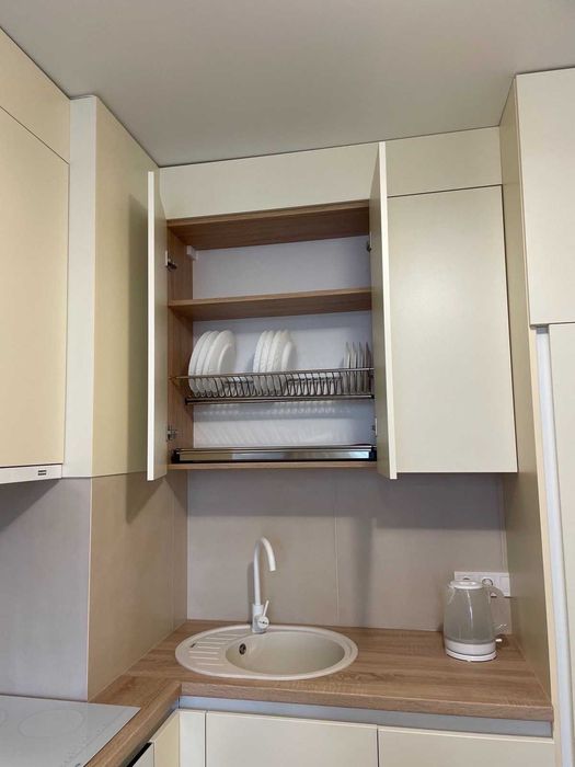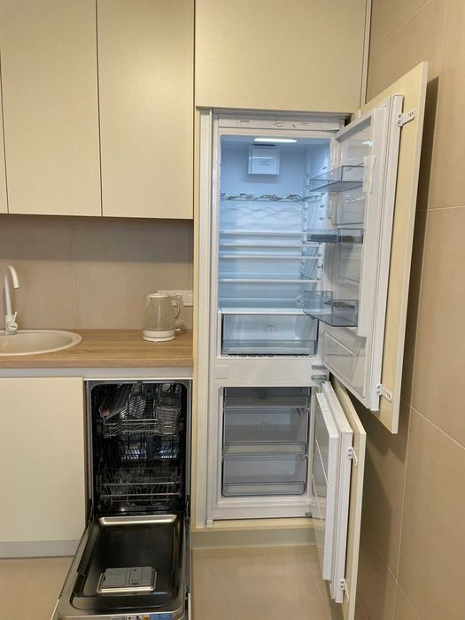 У кухні є духова шафа, електрична варильна поверхня, холодильник, посудомийна машина, розкладний диван, кондиціонер і телевізор.