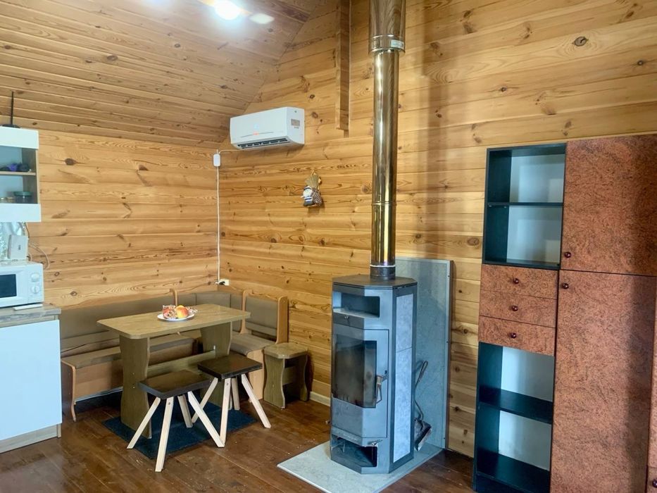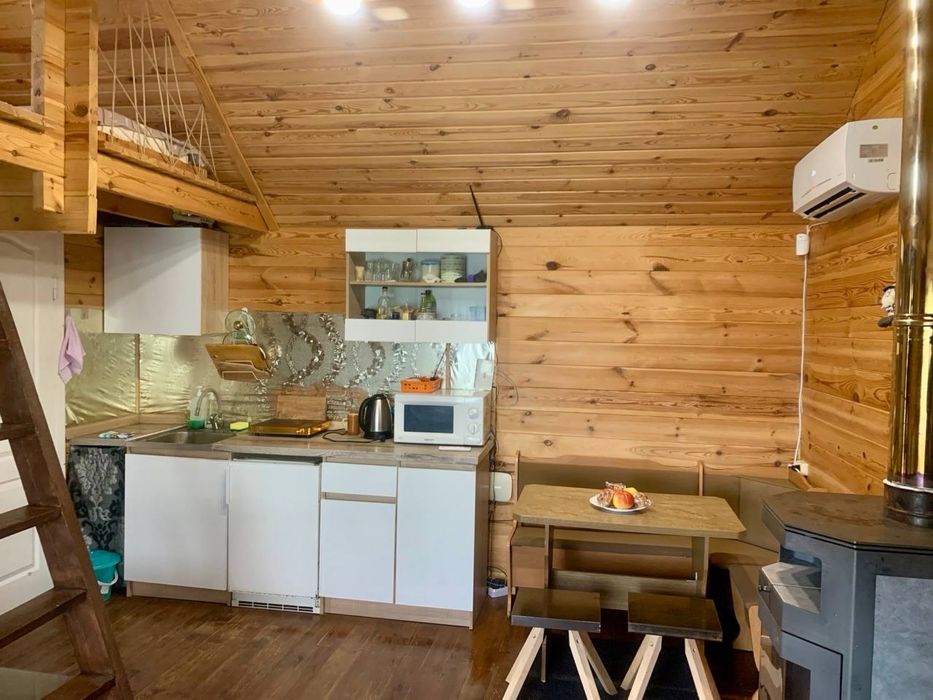 У будинку меблі, холодильник, пральна машина, бойлер, камін на дрова, кондиціонер інтернет. Планування типу кухня студія а також на другому поверсі місця для сну