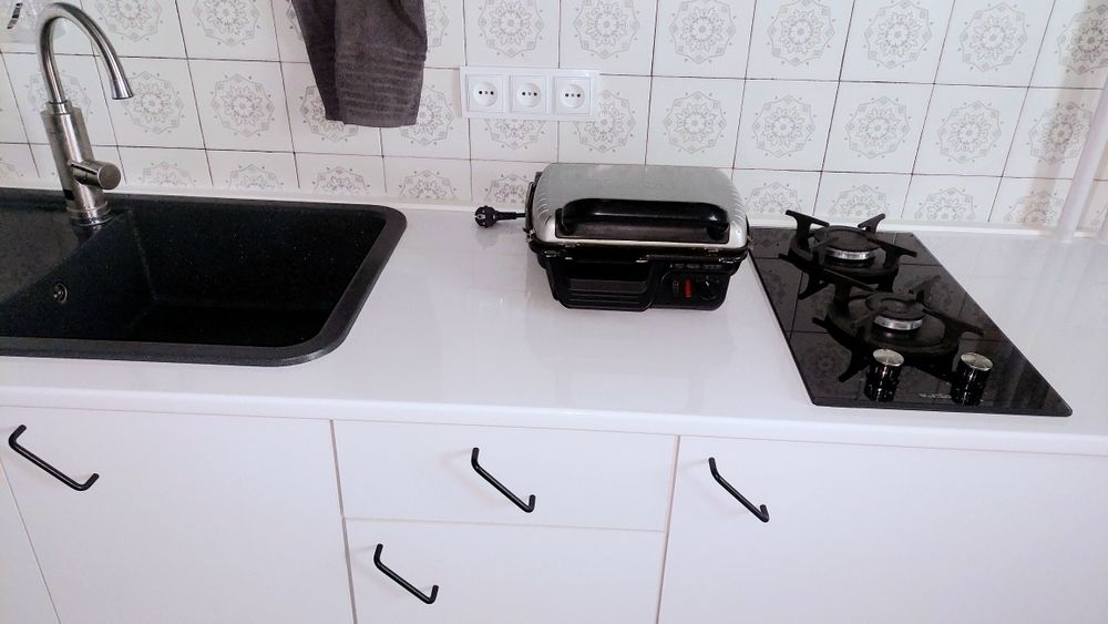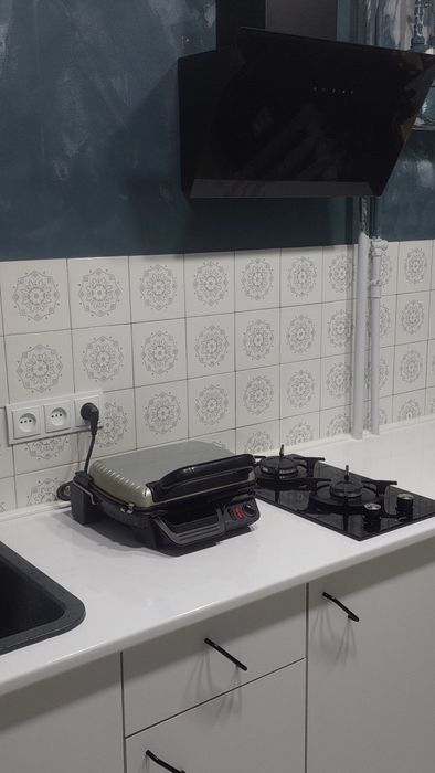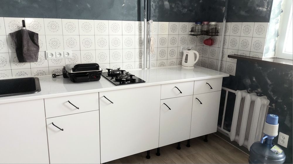 1) КУХНЯ: лінолеум на підлозі, нові меблі Jysk білі (нижній ряд шкафів) з графітовою кам'яною раковиною, електричний нагрівальний кран, холодильник Samsung, блендер погружний Braun, двокомфорна пліта чорна газова, гриль Tefal електричний, кухонні органайзери, сміттєве відро MVM 20л графіт (з педаллю та кришкою), високе підвіконня-стіл (дерев'ян.), бутиль для води 20л. з насосом механічним, витяжка Ventolux рециркуляц.з вуглевим фільтром.
