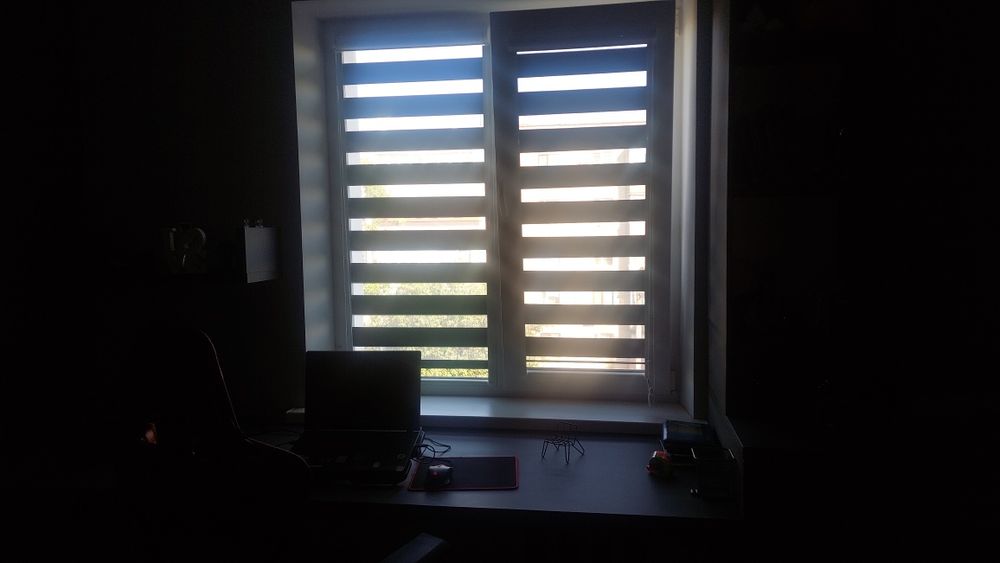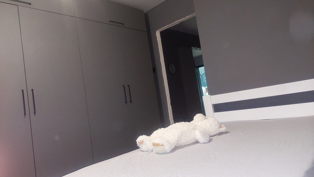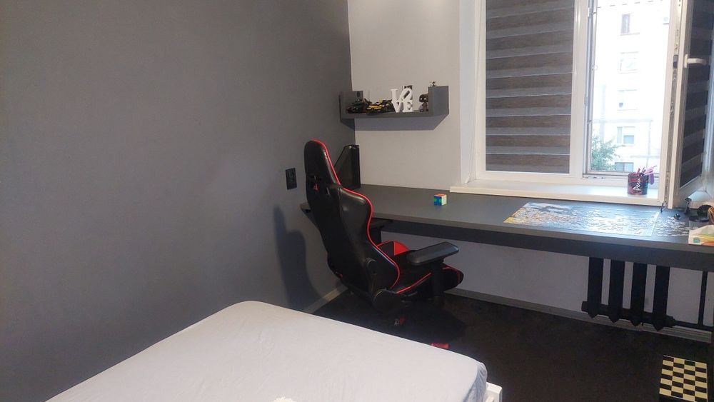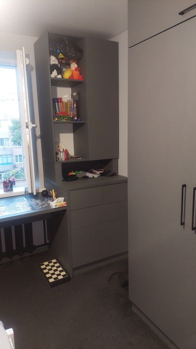 5) СПАЛЬНЯ вся в кольорі графіт: ковролін преміум класу, огромезний шкаф вбудований, огромезний стіл під стіною де вікно, комод та шафа вбудовані, дерев'яна кровать 1,5, матрас, плед сірий, жалюзі з закритою системою день-ніч преміум якості.