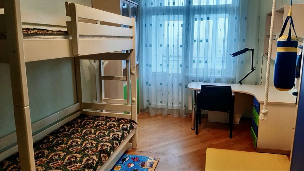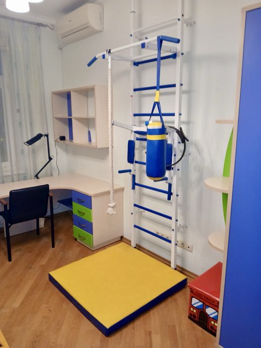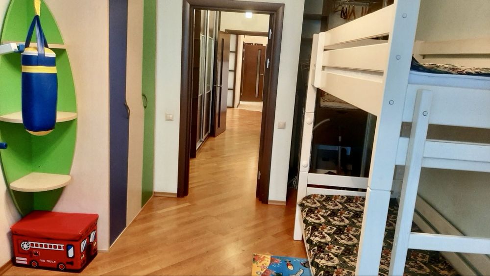 Функциональная планировка: кухня-гостинная с раздвижной перегородкой между ними, спальня, детская со спортивной стенкой и двухэтажной кроватью из дерева (кровать трансформер, можно верхнюю снять), санузел, балкон, прихожая.