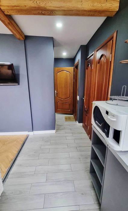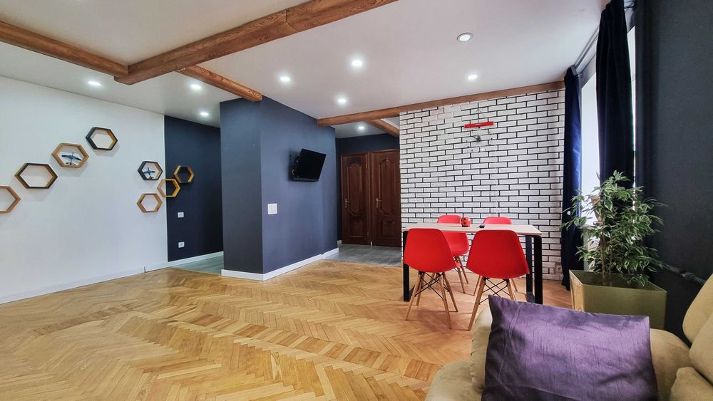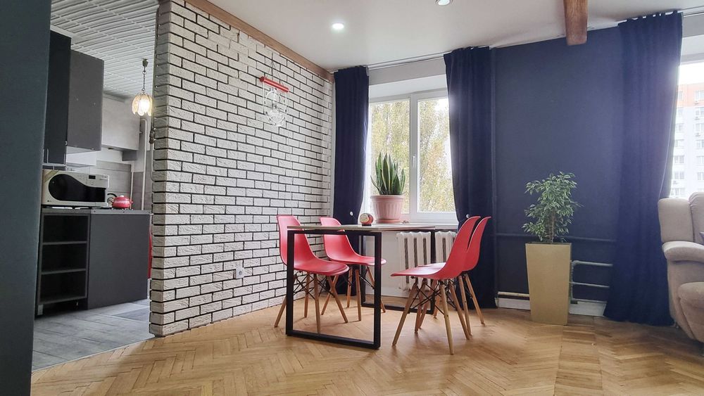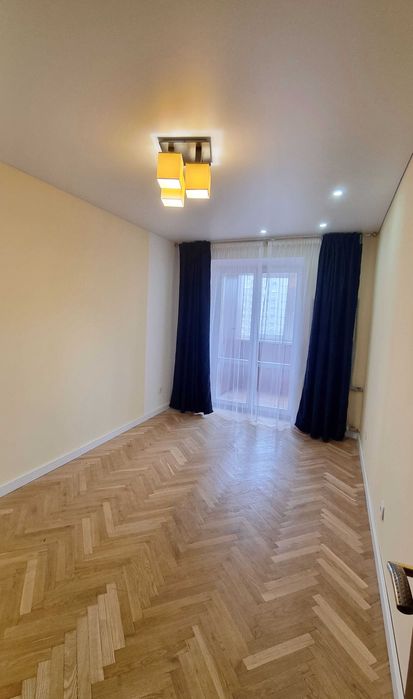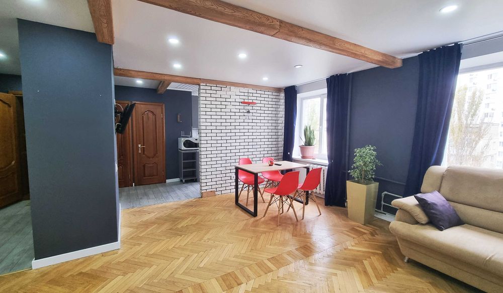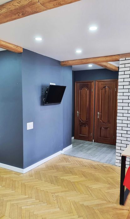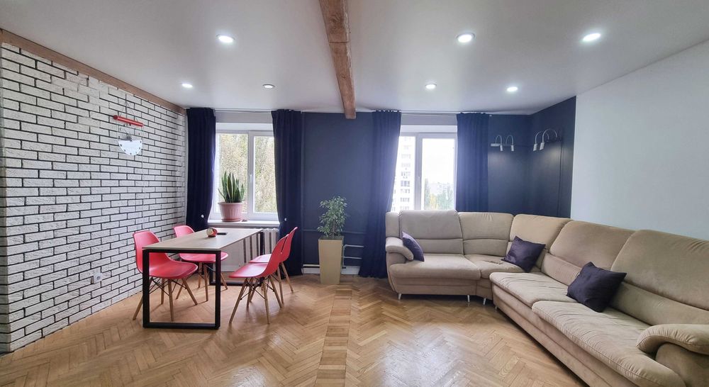 9 поверх. В квартирі свіжий сучасний ремонт. Одразу як заходите відкритий простір, в якому об’єднанні кімнати та кухня. Це створює відчуття великого простору. При цьому колона-шафа на вході все ж прикриває загальний вид, чим створює затишок.