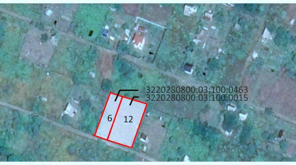 18 соток, приватна власність, дві суміжні ділянки 12 + 6 соток, кадастрові номери 3220280800:03:100:0015 / :0463 відповідно.