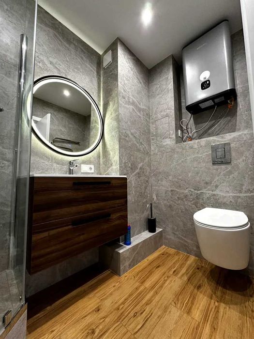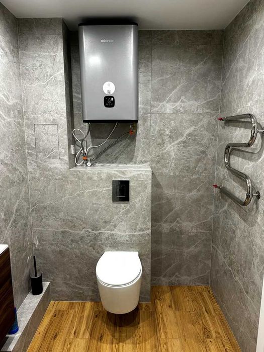 Санузел с современной сантехникой и установленный бойлер