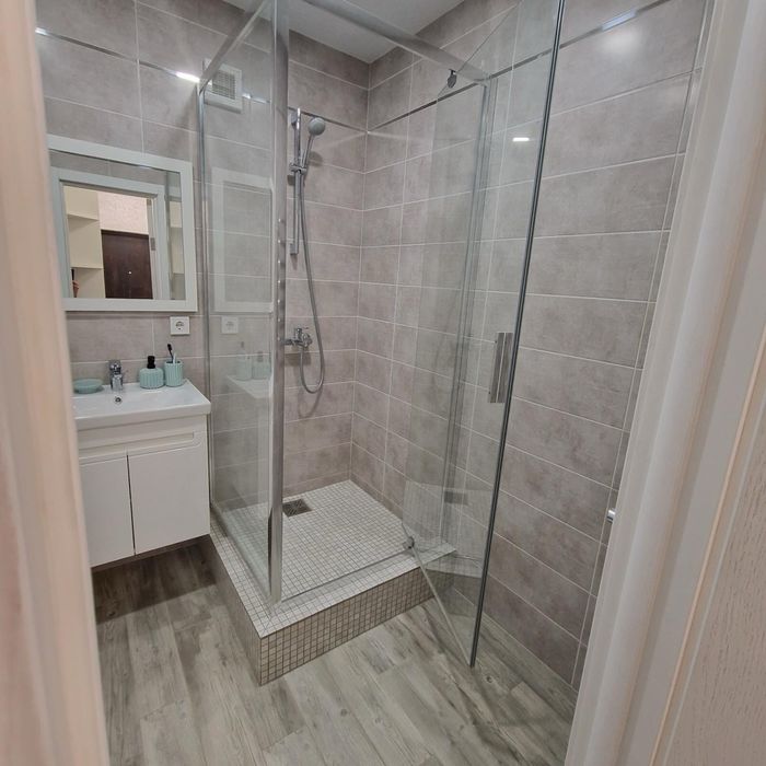 Сучасна ванна кімната з душовою кабіною, новою сантехнікою та стильним оздобленням.