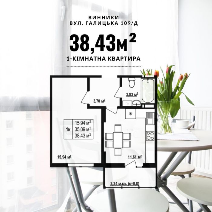 Квартира 1-км. 38,5 м2 поверх-2; Однокімнатна квартира