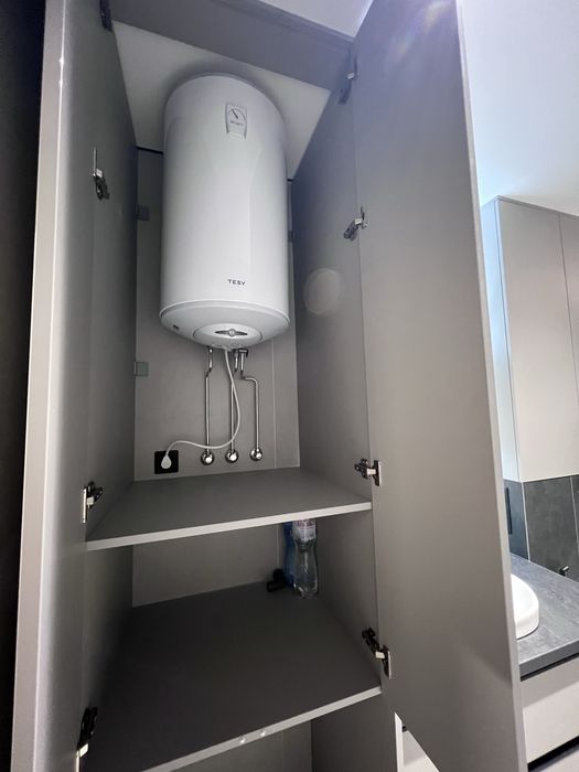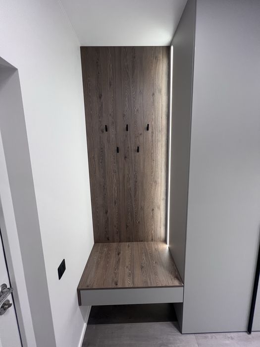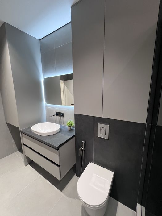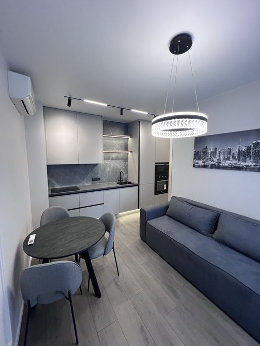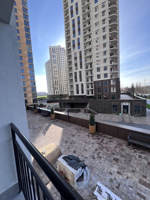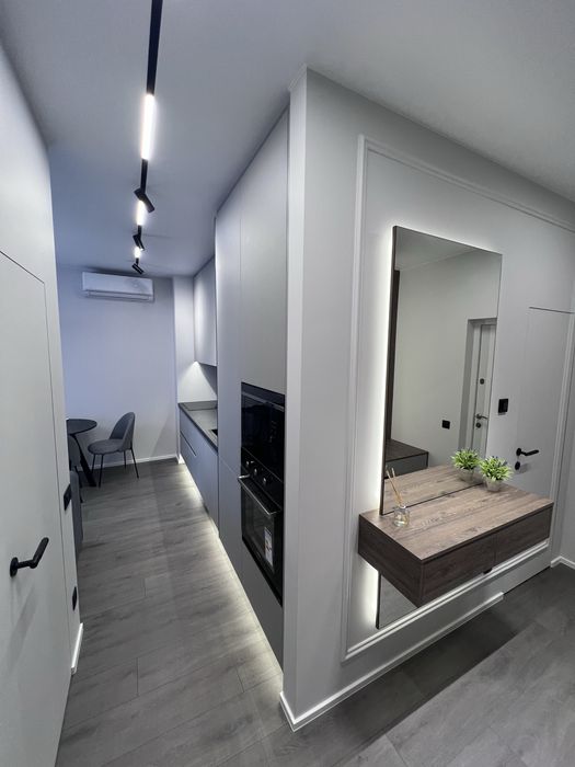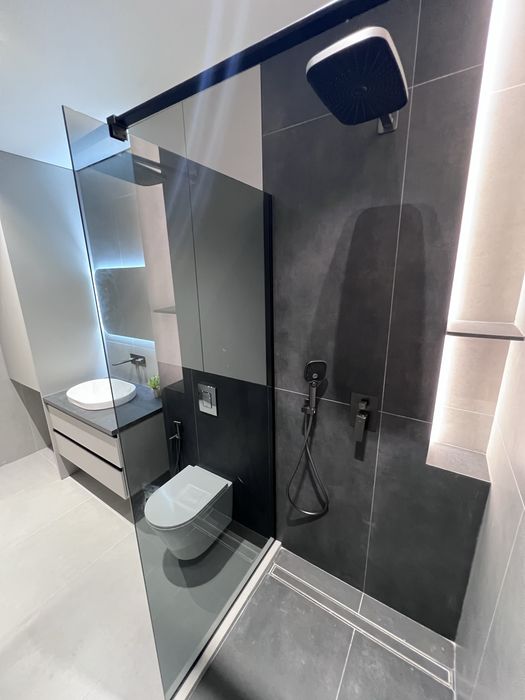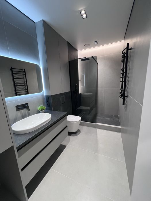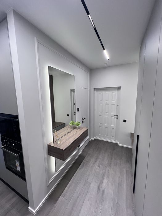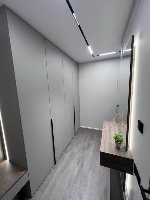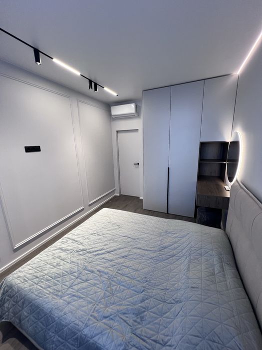 Квартира виконана під фарбування, двері прихованого монтажу, ламінат 12мм, диван розкладається, ліжко з відсіком для зберігання, меблі під замовлення, з усією вбудованою технікою (холодильник, варочна панель, посудомийна машина, духовка, мікрохвильова піч, бойлер, кух.витяжка) сантехніка вбудованого монтажу, два кондиціонери в кожній кімнаті, тепла підлога в с/в, є можливість підключення інвертора до системи.