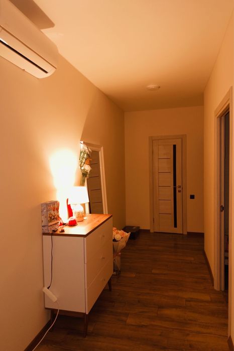 Простора ванна кімната з душовою кабіною, пральною машиною, бойлером, сучасною сантехнікою та зручними поличками для зберігання речей. У квартирі встановлено індивідуальне газове опалення, теплу підлогу в кухні та ванній, лічильники на всі комунікації, кондиціонер, інтернет. Коридор з дзеркалом у повний зріст, комодом і додатковим освітленням, а також зручний балкон із панорамними вікнами.