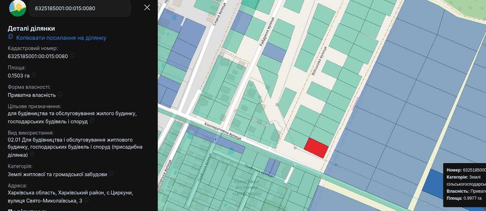 Київський; Земельну дiлянку в Циркунах, біля «Графського»; Земельну дiлянку с Циркуни, площа 0.15 Га. Земля приватизована та зареєстрована. Є можливість рожширення ділянки до 25 соток використовуючи додаткову галявину +10 соток від дороги. Через дорогу котеджний поселок Грaфckий. 400-500 м центр села, зупинка транспорту, школа, стадіон, магазини, клуб.. На відстіні 600-700м є озеро (рибалка та зона відпочинку). Також неподалік є велике «Вялівське» водосховище (водобуд), до пляжу 3-3,5 км. Поряд вулиця (Коперетивна), асфальтована та має освітлення. Ділянка знаходиться на пагорбі, що є дость добре від замокань, а також відкриває мальвничий вид на місцеві краєвиди та м. Харків.