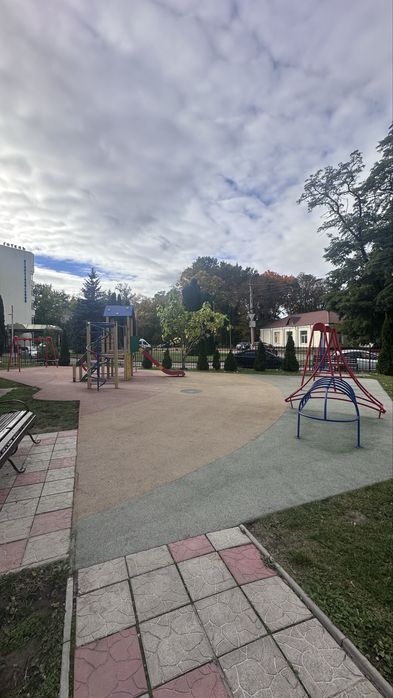 Закрита прибудинкова територія з кількома дитячими майданчиками.