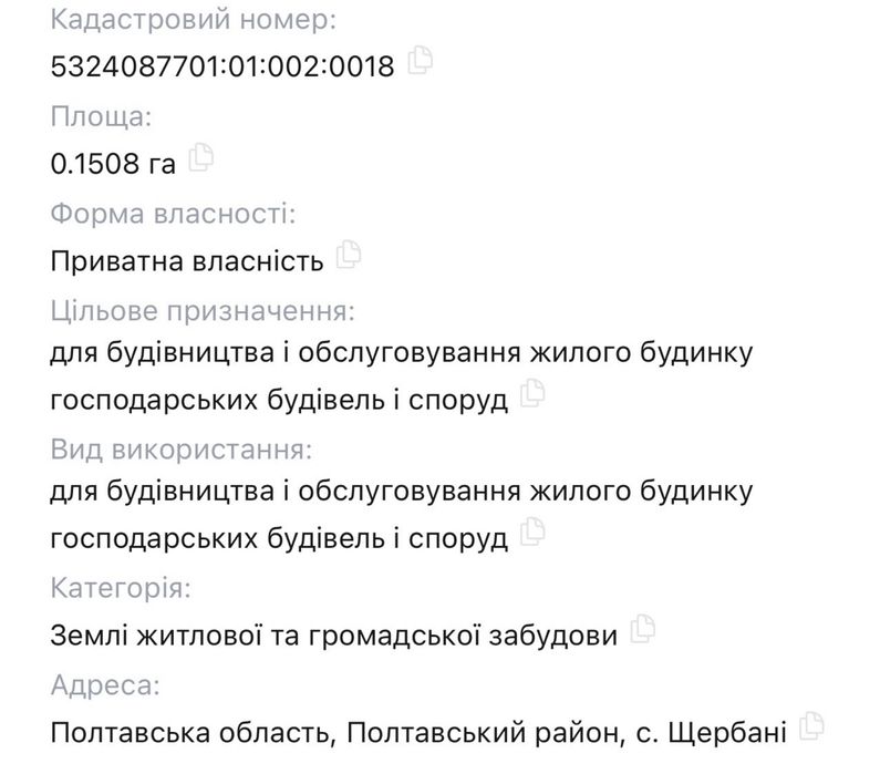 ТЕРМІНОВО продам земельну ділянку під будівництво с. Щербані.; Терміново продам земельну ділянку під будівництво в красивому живописному місті на окраєні міта Полтава , с. Щербані. Площа 0,1507 га . Комунікації: електроенергія підʼєднанна до ділянки, газ, водопостачання можливе швидке підключення (проходять поруч) . Поруч житлові забудови, зручний підʼїзд, асфальтована дорога.Переваги ділянки: оптимальний розмір під будівництво житлового будинку, дуже близько до міта Полтава- 1 хв. автомобілем. Тиха вулиця, поряд магазини ,транспорт, інфраструктура( Школа , амбулаторія та інші). Рівна ділянка. Поряд ліс, ставки , ідеальне місце для життя та відпочинку. Приватизована. Деталі за телефоном 09******45